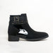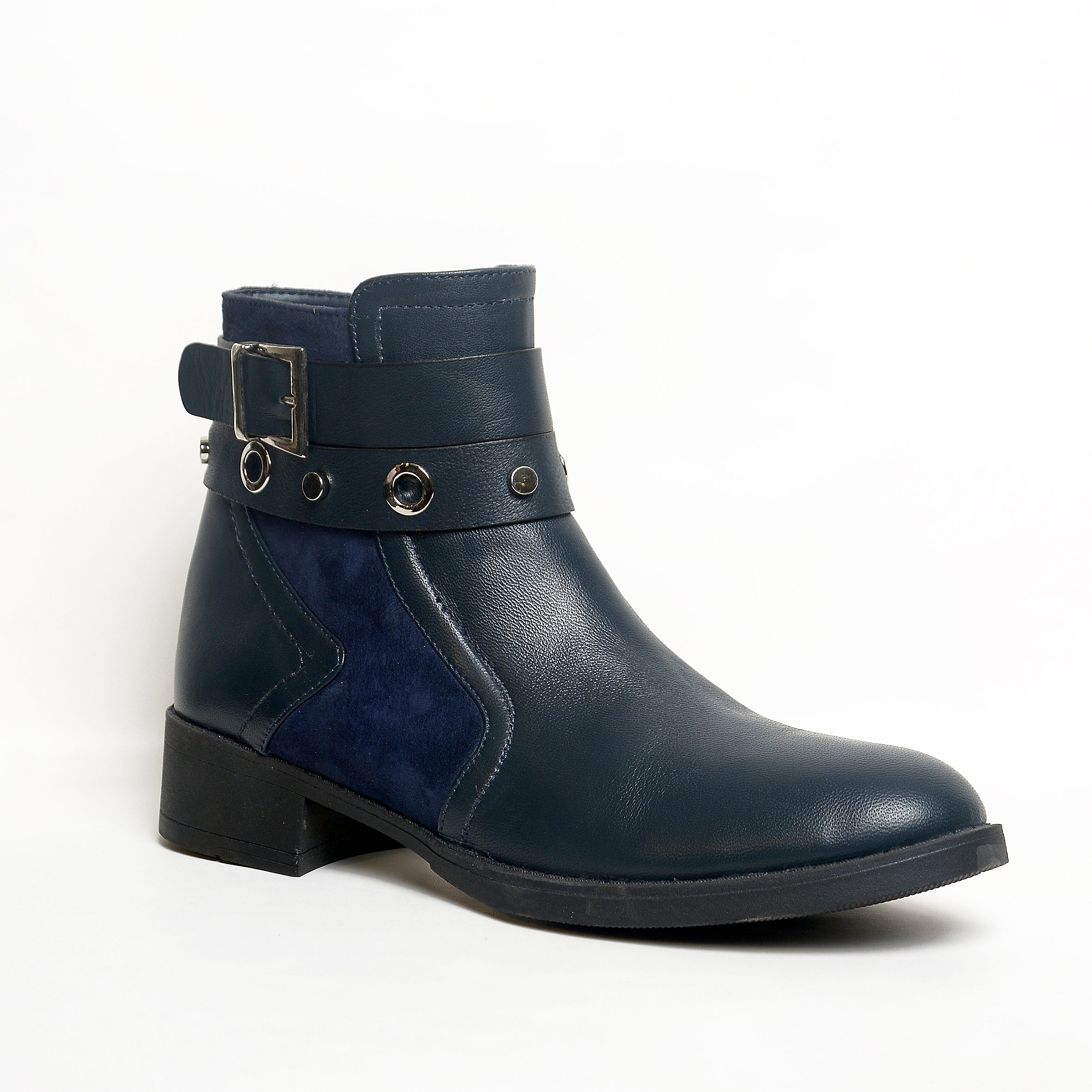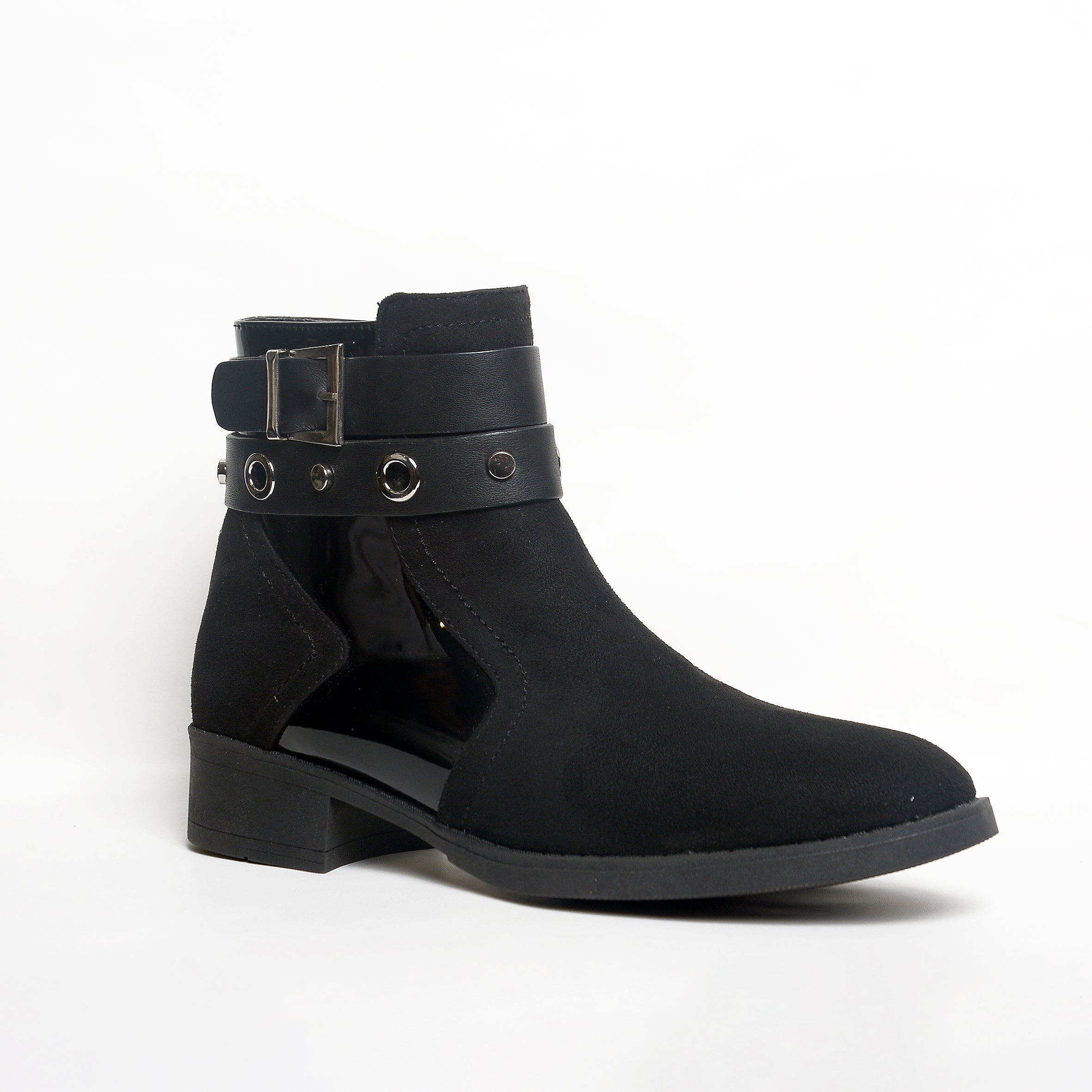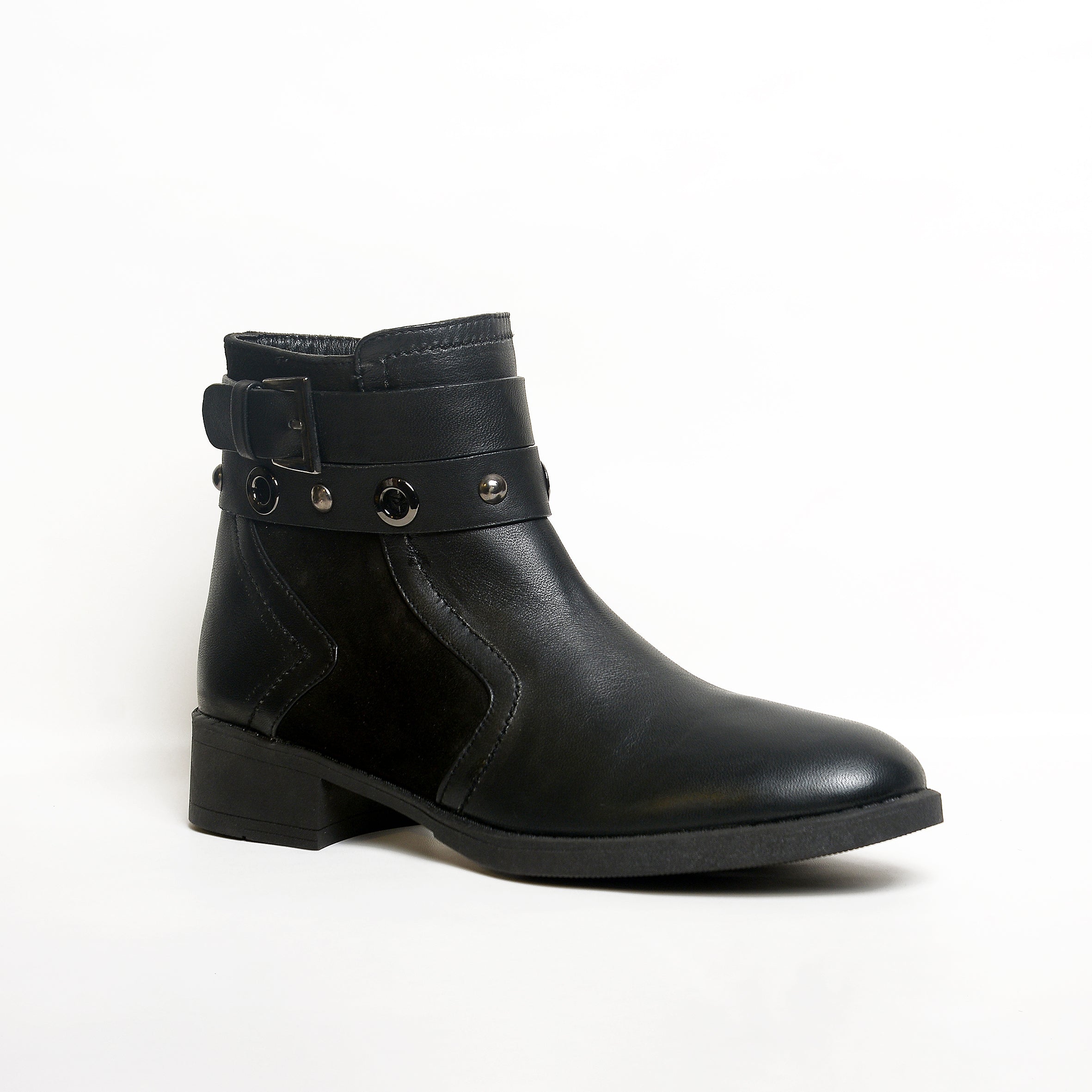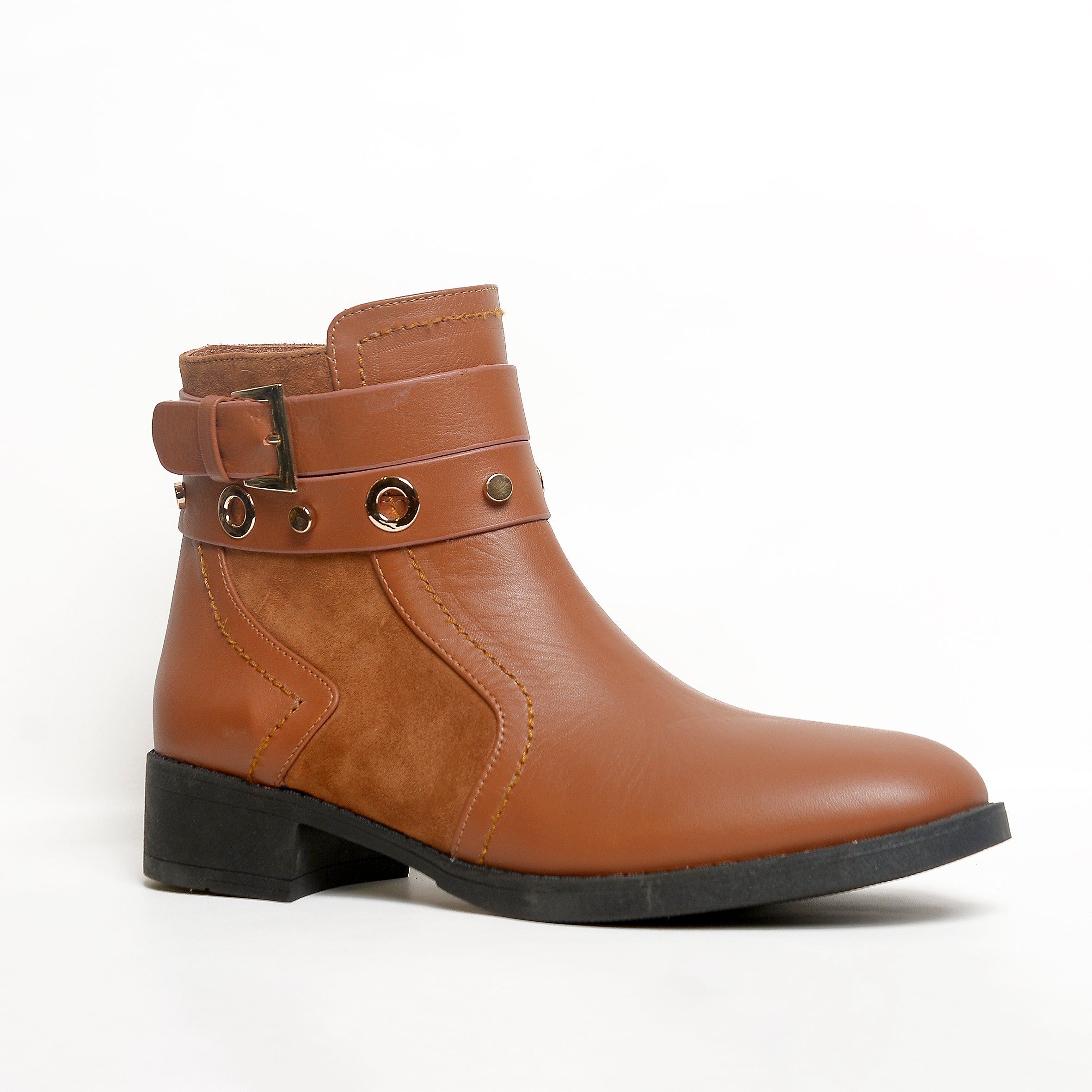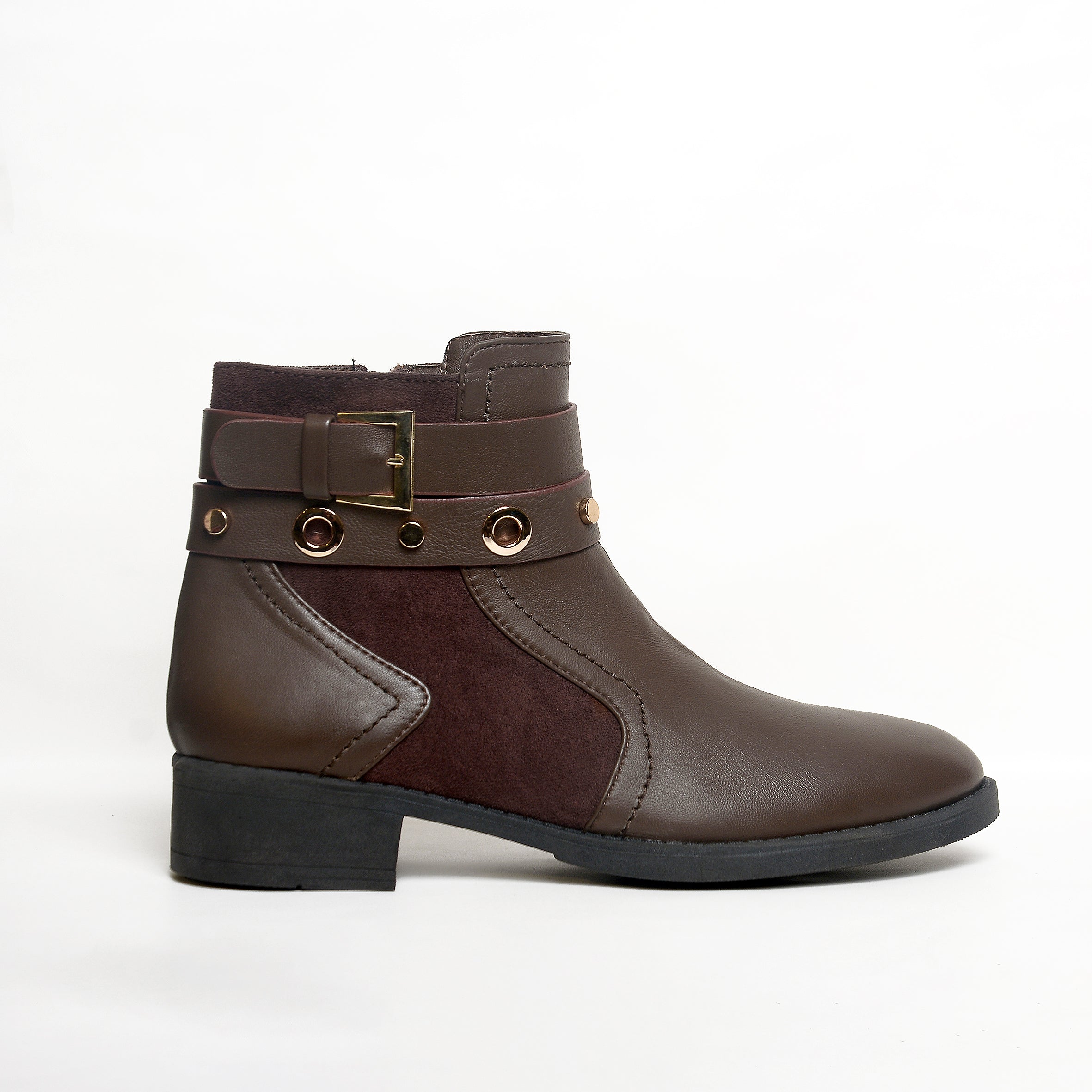 The ankle strap features metallic rings and a signature buckle detail, adding edge and attitude while keeping the design classy. With a low, comfortable heel and soft inner lining, these boots are perfect for all-day wear — from casual mornings to evening outings.